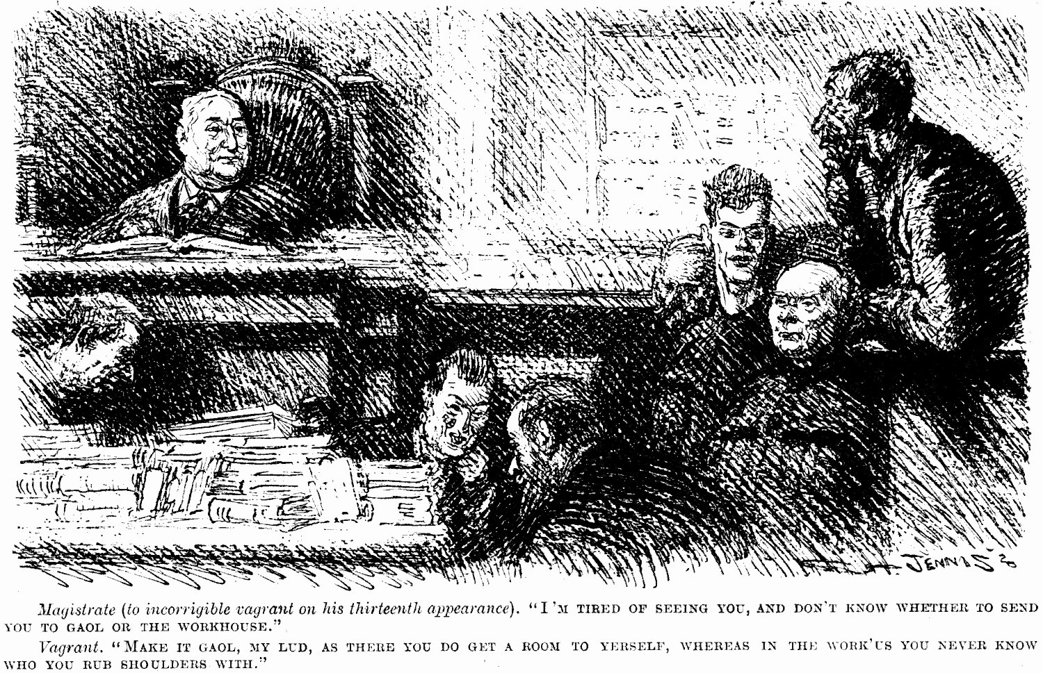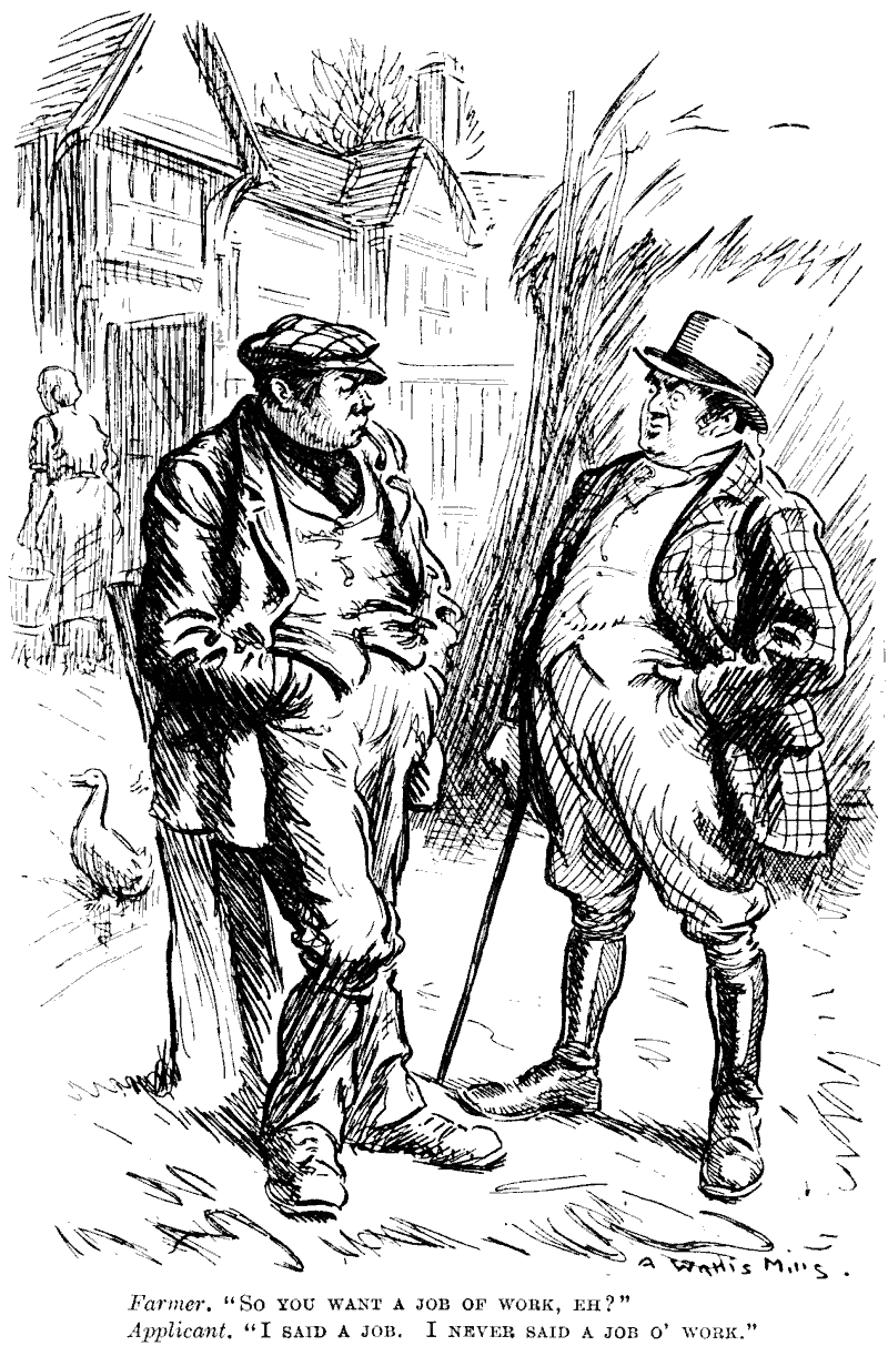 Magistrate (to incorrigible vagrant on his thirteenth appearance). "I'm tired of seeing you, and don't know whether to send you to gaol or the workhouse."